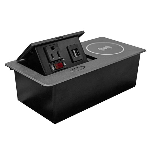 AccesoriosCaja rectangular oculta de conexiones múltiples con cargador inalámbrico de base, cuenta con sistema incorporado de apertura por medio de mecanismo...